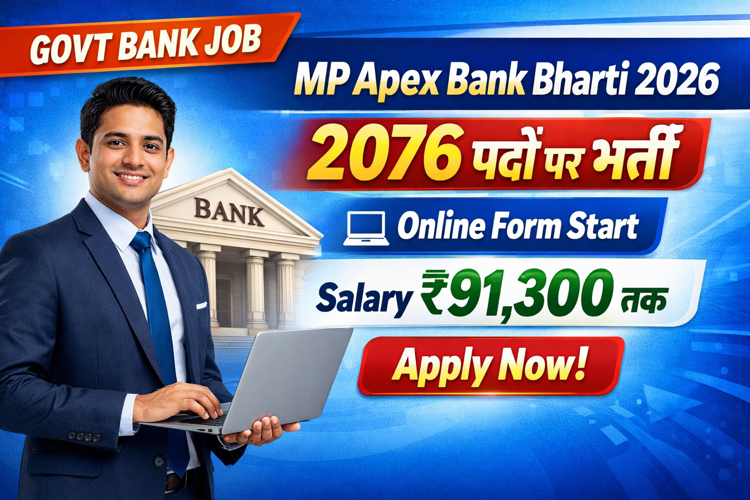 MP Apex Bank Bharti 2026 : 2076 पदों पर भर्ती, ऑनलाइन आवेदन शुरू, सैलरी ₹91,300 तक